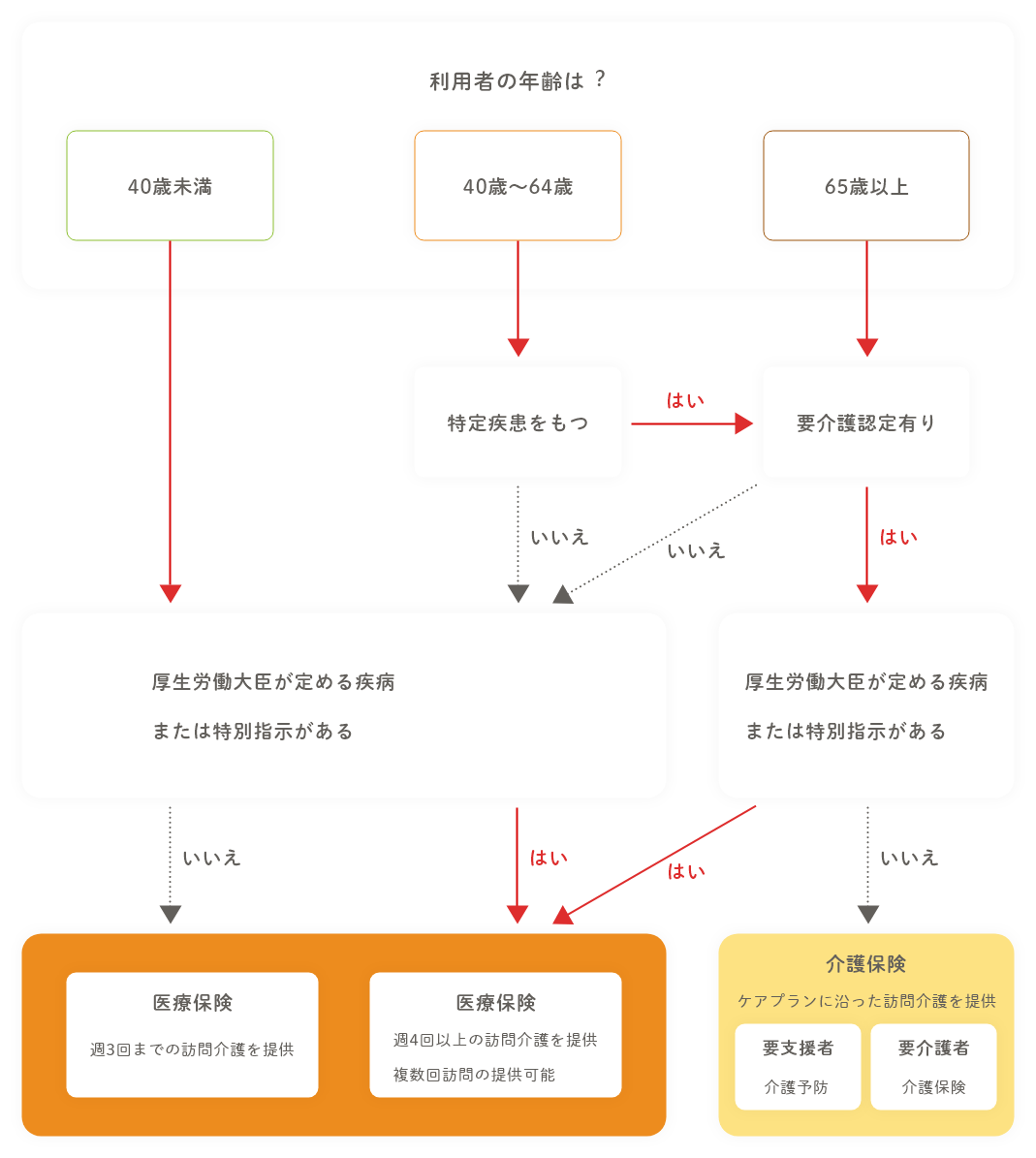 年齢、病名、要介護認定の有無により、「介護予防」「介護保険」「医療保険」のいずれの社会保険が適用か決まります。